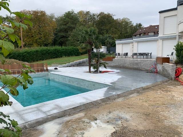 ID Rénovation - ID Construction, spécialisé en aménagement extérieur, vous offre ses services pour la réalisation d'un escalier suspendu, d'un mur, d'une terrasse, rénovation de la piscine, l'ensemble en pierres naturelles.