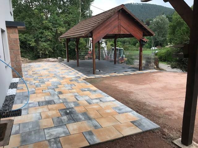 ID Rénovation - ID Construction, spécialisé en aménagement extérieur, vous offre ses services pour la réalisation d'une terrasse en grès cérame, d'une allée en pavés et d'une cour en enrobé.